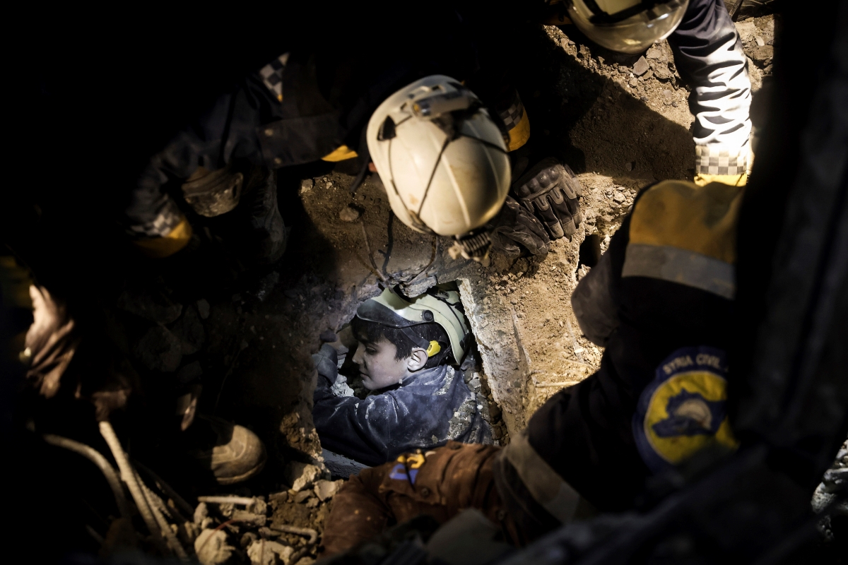 当地时间2023年2月8日,叙利亚金德利斯,叙利亚民防组织“白头盔组织”正在努力营救一名被困在坍塌建筑下的男孩。